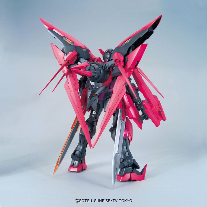 登场于人气动画《敢达创战者》,以1/100比例mg系列模型化;mg系列无论分色细节还是可动范围都表现优秀,可满足玩家对细节及实感的追求;附属暗物质推进装置、冰火剑等武器装备;gn电容器采用透明零件造型更华丽;