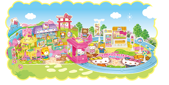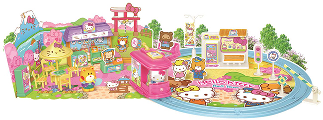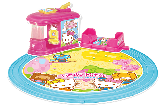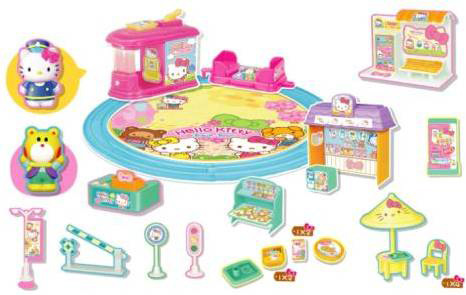 hello kitty妙趣世界-铁路之旅,在硬卡纸地台下分为2个部分,左边是丁丁车 轨道,hello kitty站长将带你360°环绕观光;而右边则是露天休息的桌椅及纪念品店,瞬间进入了休闲旅游观光于一体的妙趣世界。 随盒附送hello kitty以及她朋友thomas的人偶。