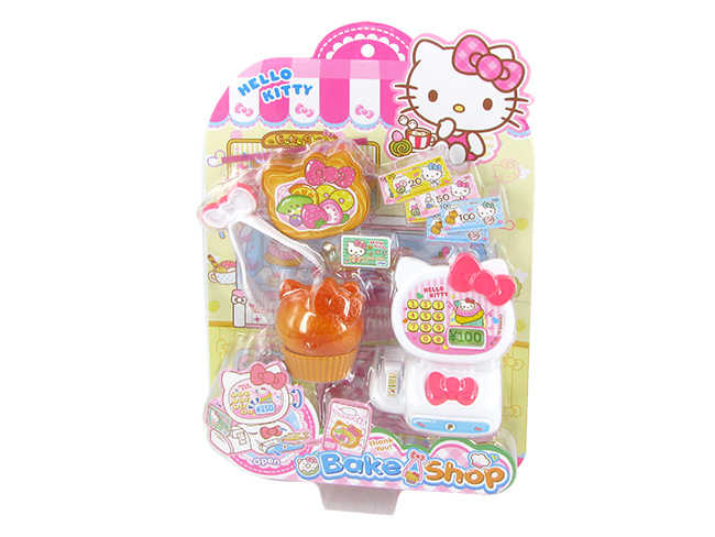 hello kitty面包店,卡纸折叠可当做面包店场景,把挑选好的美味糕可用夹子放入袋中,并到收银机处付款(现金/刷卡都可以哦),收银机具备显示价格和弹出收纳柜的功能。 店内有水果蛋糕和纸杯蛋糕供顾客选择,快来为自己悉心挑选一件可口的蛋糕吧!