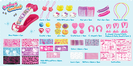 hello kitty手工diy系列-百变蝴蝶结机,里边能制作出发箍配饰、发夹配饰、发叉配饰、钥匙扣等,可组合超过100种蝴蝶结的款式!!!样式多元素的丝带、实用又造型百变的小饰件、简单的教程、带有hello kitty可爱元素的配件。通过蝴蝶结机,轻松的一按,便组成各种百变的蝴蝶结。