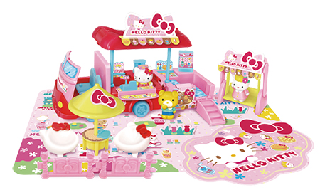 凯蒂猫街角物语快餐车包括一部快餐车,车厢展开后分别有贩卖区与餐饮区,各区域陈列摆放出不同摆设,还有摇摆椅与可爱造型的露天遮阳茶座,另加送凯蒂猫、裘弟、菲菲三个小小人偶,完全是凯蒂猫商业区必不可少的一部分。