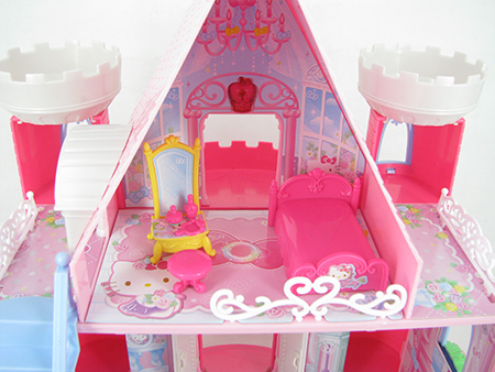打开包装盒,一个粉红色的hellokitty城堡就出现啦。三角形的淡粉色屋顶镶嵌上一个可爱的hellokitty猫头,屋顶上飘扬着kitty国的国旗,一个粉红色的开阔阳台,楼下一个大大的罗马式半圆形的拱门,加以金色图腾装饰,两边两个苹果形的灯座,把城堡装点的格外可爱,主建筑两旁的两个圆形瞭望塔,更加凸显了城堡的欧式风格,塔楼上的四个小窗台,使得整个建筑生动起来,一楼的窗台上还布置了绿色的花坛。推开一楼的大门耳边响起了清脆的门铃声,穿着礼服带着皇冠的kitty公主正站在客厅迎接我们呢!客厅的墙壁上挂着kitty家族的照片,往下按压大门左边的灯座,客厅的顶灯与卧室的苹果等一同亮起,整个房间都变得明亮起来,通过玄关的金色雕花的扶手楼梯进入客厅,一套华丽的欧式家具引入眼帘,复古沙发上躺着两个可爱的迷你靠垫,小小的茶几上摆满了精致的茶点。