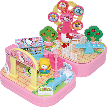 该玩具由众多的景物零件、情景地台与kitty角色人偶所组成,首先小朋友需要把景物零件从零件框上面一个个地剪下来;各情景零件按照包装盒子背面的说明去贴上产品中相应的贴纸,然后再按说明简单地拼装起来;最后,小朋友还需要发挥自己的想象力,把这些零件按自己的喜好放置到情景地台上,从而搭建出各种各样的kitty童话世界情景。该玩具不但造型可爱,能可以让小朋友充分发挥自己的创造力和主动性。