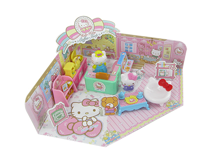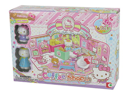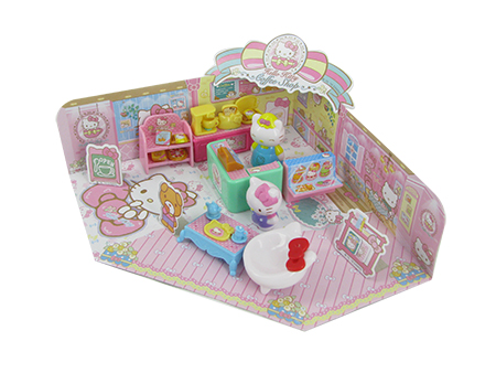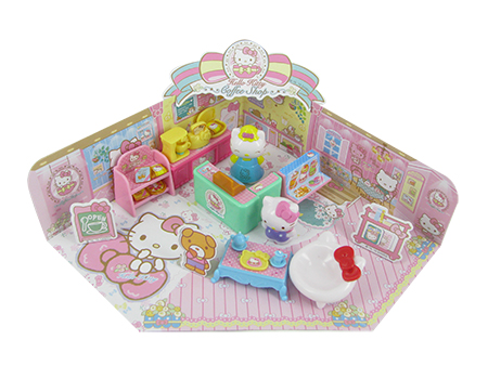 helle kitty 咖啡店,在硬卡纸地台及围墙的包围下,摆放舒适的沙发、桌子、书柜、搭建收银区、厨房等,另加送凯蒂猫及凯蒂猫妈妈两个小小人偶,快来帮助凯蒂猫经营她的咖啡店吧。