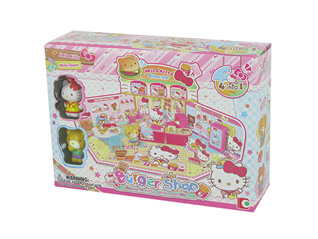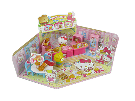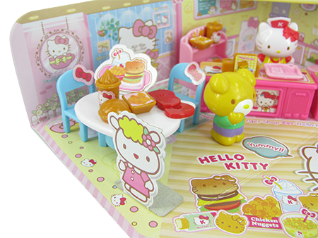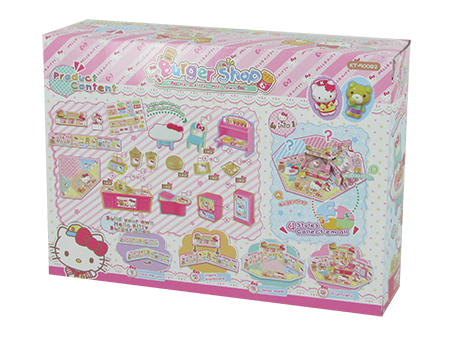 helle kitty 汉堡包店,在硬卡纸地台及围墙的包围下,摆放桌椅、柜台、收银机、厨具等,另加送凯蒂猫及她的朋友小熊两个小小人偶,快来帮助凯蒂猫经营她的汉堡包店吧。
