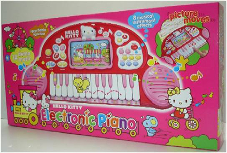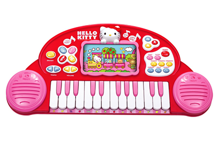 以kitty造型为蓝本的多功能电子琴 不但颜色鲜艳,造型可爱,能很容易令小女孩产生兴趣,而且还有多种伴奏、演奏、变换乐器、录音等功能 。电子琴中央部分的画面会随演奏而向前循环移动,犹如动画播放。