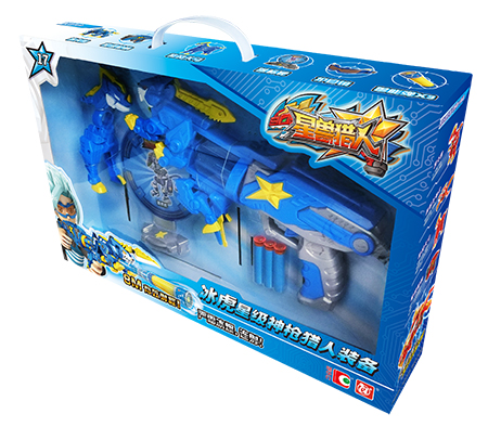 完整猎人装备, 可让小朋友体验扮演动画片中的猎人"战斗". 神枪由冰虎星兽、旋风天马、星级枪柄组合而成,可一次装入5发兽能弹、通过上膛和扣动扳机的交替动作实行连续发射. 配备猎人护目镜和星兽标靶,随时随地开始"战斗". 射击距离可达8米. 使用专用兽能弹. 产品包含兽能弹3发